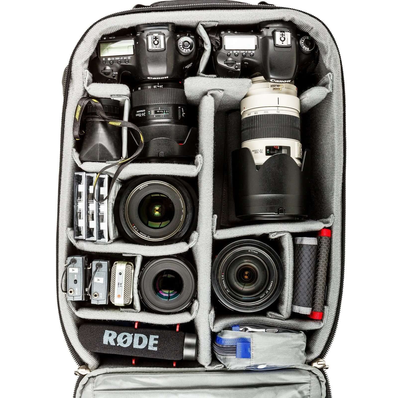 <li>Example: Nikon D4s attached to 70-200mm f/2.8, D810 attached to 500mm f/4, 24-70mm f/2.8, 15" MacBook Pro</li>