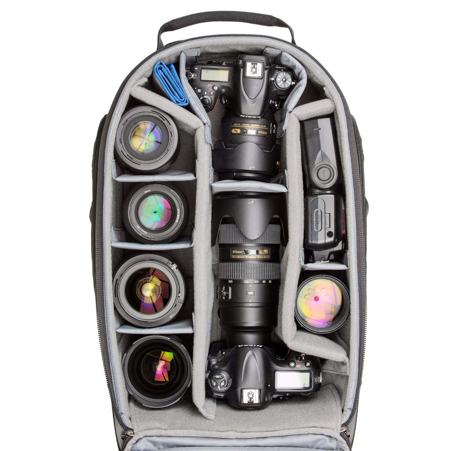 <ul> <li>Holds 1 gripped DSLR, 1 standard DSLR, 5–7 standard zoom lenses and a 15” laptop</li> <li>Holds 1 gripped DSLR, 5–7 standard zoom lenses, a flash, and a 15” laptop</li> <li>Maximum lens size: 200–400mm f/4</li> </ul> <br><strong>Examples:</strong> <ul> <li>Nikon D4s with 24–70mm f/2.8 attached, D810 with 14–24mm f/2.8 attached, 70–200mm f/2.8, 105mm f/2.8, SB900 (x2), and a 15” MacBook Pro</li> <li>Canon 1DxII, Canon 5DMIII with 70–200mm f/2.8 attached, 16–35mm f/2.8, 24-70mm f/2.8, 100mm f/2.8 macro, 50mm f/1.2, 2x teleconverter, 600EXII flash (x2), 15” MacBook Pro and a 12.9” iPad Pro</li> </ul>